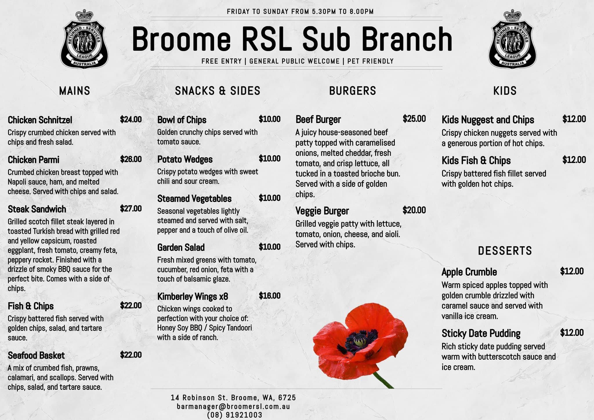 The Broome RSL Club is committed to providing a place to call home for service, affiliate and social members. We are proud to provide quality service to Broome residents and visitors while honouring our history and values.