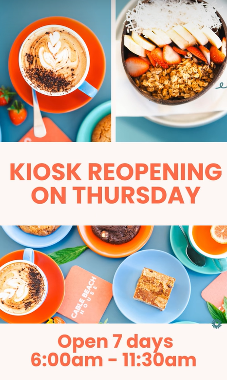 Cable Beach House kiosk re-opening on Thursday 19th February 2026.