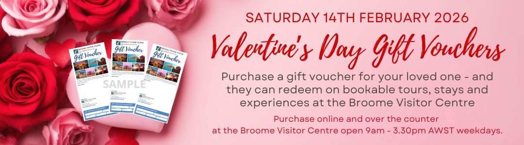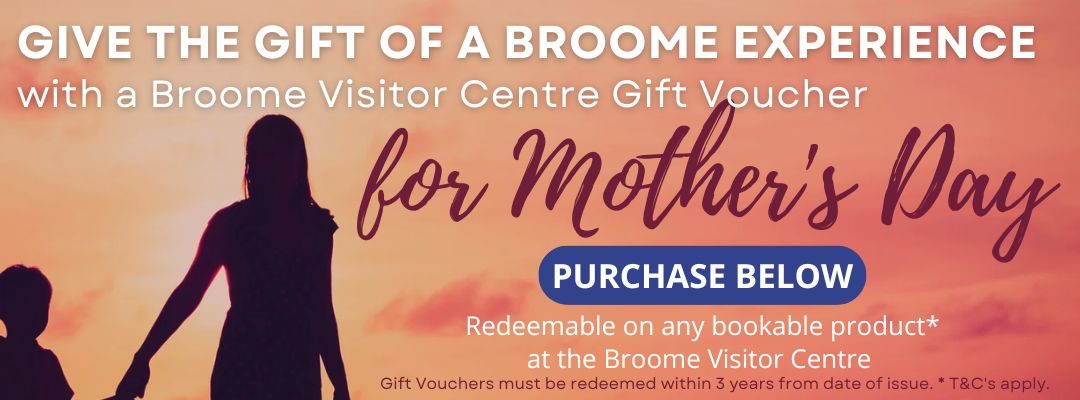 Broome Visitor Centre Gift Vouchers are redeemable on any bookable tours, car hire, accommodation or experience from our bookable members. You can also spend your voucher on retail items at the Broome Visitor Centre. If you wish to purchase over the phone, give us a call during business hours on 08 9195 2200.